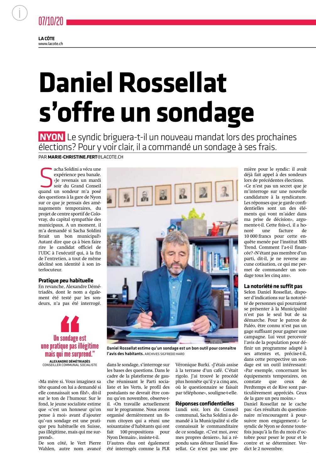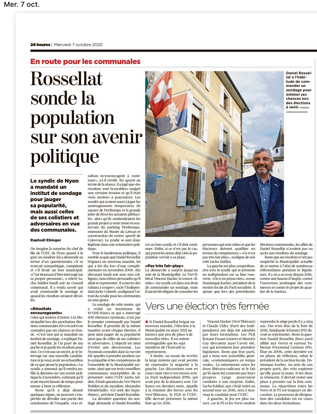 Les quotidiens 24Heures et La Côte reviennent sur le sondage que Daniel Rossellat a mandaté en vue des élections de 2021.
